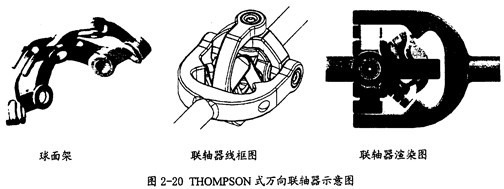 將環叉式萬向聯軸器的中間直線分度桿轉變為球面分度機構,就成為一種新型的等角速萬向聯軸器,這就是THOMPSON式萬向聯軸器其結構如圖2-20所示。