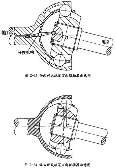 球籠式萬向聯軸器是目前性能最優良,應用最廣泛的一種等角速萬向聯軸器,根據結構形式的不同可分為兩大類,即導向桿式球籠萬向聯軸器和偏心距式球籠萬向聯軸器,分別如圖2-23和圖2-24所示。