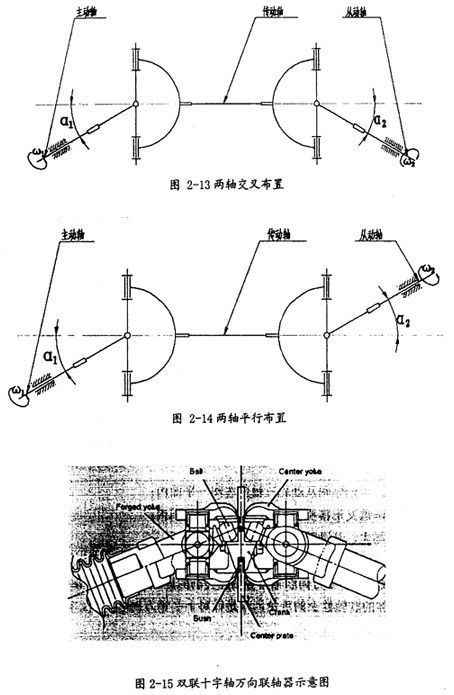 現假設有兩個十字軸萬向聯軸器,按圖2-13或圖2-14聯接在一起,主動軸同從動軸與中間軸之間的夾角分別為a