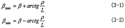 由于在轉動的過程中,三叉桿交點作旋轉運動,因此會導致輸入軸與輸出軸之間的夾角發生變化,其變化范圍為βmin~βmax,當O點(見圖3-5)處于輸入軸與輸出軸轉動錐中心線所構成平面的兩個極限位置時,偏轉角達到兩極值:
