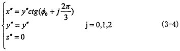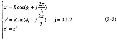 由于動坐標系O″X″Y″Z″的O″Y″軸取得始終垂直于固定坐標系OX軸,可認為先把OXYZ坐標系繞OX軸轉過夾角θz,使OY軸與O″Y″軸平行,再繞新的OY軸轉過θy,使OX軸與O″X″軸平行,OZ軸也同時平行于O″Z″軸(變換空間位置如圖3-6所示)。則固定坐標OXYZ與動坐標系間的變換關系如下: