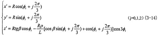 為半徑的圓,其中R為輸入軸滑道軸線至。輸入軸軸線的距離(圖3-4中有其示意),β為輸入、輸出兩軸線之間的夾角(圖3-5中有其示意),L為圓錐擺中軸線長。所以采用調心軸承安裝輸出軸時,輸出軸的運動必為一圓錐擺運動,三叉桿中心的偏心距P比值