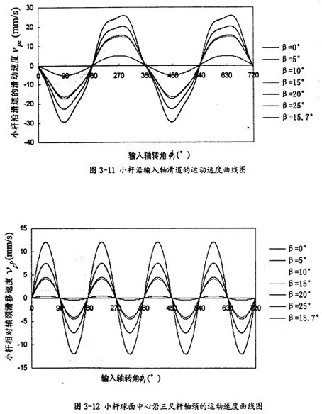 由曲線圖3-12可以看出,小桿球面中心P沿軸頸的線速度隨兩軸夾角β的增大其最大值增長也較快,它的變化頻率為一個回轉周期2次,曲線上下對稱這一數值可以作為動力分析中摩擦計算的重要依據。