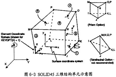 此單元為3-D固體結構單元,由八個節點組成,在單元的每一節點上有三個自由度,即分別沿著三個坐標軸的方向。此單元可以進行塑性、蠕變、應力硬化、大變形以及大應變分析,是結構分析中的最常用單元。單元結構如圖6-3,此單元有兩種退化形式(見圖6-3右邊)。