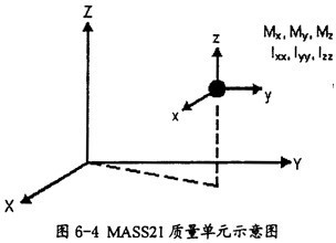 此單元為一個有六自由度的質量單元。此單元的第一個不同的坐標方向上可以施加不同的質量大小和轉動慣量。質量單元是由單個節點、單元坐標方向的集中質量系數、單元坐標軸的旋轉慣性所決定的。為了在加入質量單元后不影響系統的慣性屬性,在此單元的實常數設定中慣性量應設定的非常小(如小于10-4)。單元如圖6-4所示。