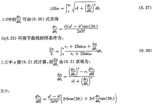 從以上設計過程可以看出,根據非圓太陽輪設計行星輪為圓的純滾動非圓行經齒輪傳動機構時,并不是對任意指定的太陽輪節曲線都有解。當太陽輪節曲線的周期數n1給定后,節曲線必須有兩個可調整的參數(例中的a和b)的要由節曲線的封閉條件及輪齒等分條件來確定。齒輪模數m和太陽輪齒數z1是被預先指定了的。當各參數求出后,要用不干涉條件(6.28)式進行校驗,若發生干涉,應調整z1數值,重新計算太陽輪的可調整參數。