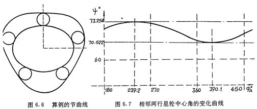 節曲線形狀如圖6.6所示。圖6.2為該輪系加上輪齒后的情形。按(6.34)式可算得相鄰兩行星輪之間的夾角隨