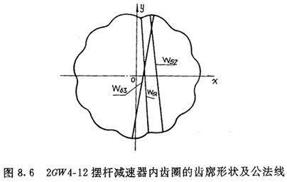 將2GW4-12擺桿減速器的設計參數代入公法線條件式(7.79)中,并給外滾子半徑Tz以增量0.18mm代入,可得到三條不同長度的公法線,如圖8.6所示。