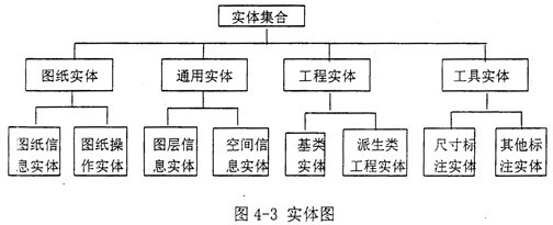 在面向對象的CAD集成開發系統里,系統數據模型的基本元素就是ARX開發語言中的(多是C/C++語言)類,類實例化后稱為對象或實體,整個圖紙就是一個實體集合,主要由四大塊組成:圖紙實體集合、通用實體集合、工程實體集合和工程實體集合。其中,圖紙實體、通用實體和工具實體都為獨立類,沒有父類或子類;而工程實體集合中的各工程實體是由具有基本特征的基類實體派生而來,具有一個基類和若干個派生類,并且各實體集之間互相獨立(如圖4-3所示)