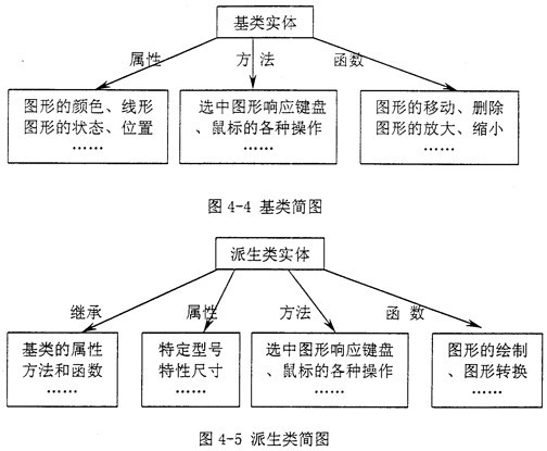 在上面所說的四種實體里,圖紙實體、通用實體、工具實體都是一些簡單實體,基本上是對一些AutoCAD的操作命令進行集成,使之能夠對工程實體進行操作,并且符合不同行業的命名規則。而最復雜的是工程實體,首先,每個行業中工程實體的種類繁多,必須進行細致有序的分類,使之符合行業習慣;其次,確定基類與派生類之間的關系,有效地定義基類的各個屬性、方法和函數,便于擴充派生類;最后,要完整的定義每一個工程實體的所有的屬性、方法和函數,特別重要的是,要很好地利用AutoCAD已提供的所有信息資源。對于以上的問題,第一,要對行業的需求十分清晰,能夠對行業中涉及到的工程實體進行歸納,要具有“面向對象”的編程思維;第二,基類涉及的屬性方法和函數基本上與實體圖形的操作有密切關系(如圖4-4所示);派生類主要涉及到工程實體的特征屬性、特征方法和特征函數(如圖4-5示),完整地定義其基類和派生類是“面向對象的CAD集成開發系統”中的核心部分;第三,要充分的利用AutoCAD已提供的資源,主要就是要利用AutoCAD系統中的*,dwg文件的圖形文件數據庫中的資源,熟悉各種AutoCAD中實體(例如點、直線、圓弧等)的DXF碼規則,并從中提取相關特征信息;第四,由于在AutoCAD中的.dwg文件中,存儲的是一些簡單的幾何的點、直線、圓、弧等信息,故還需要另一個文件去記錄整個圖紙的工程實體圖形的邏輯關系(下一節詳細介紹),隨同*.dwg文件的打開而打開,標識*.dwg文件圖形中的實體圖形邏輯關系,隨同*.dwg文件的關閉而記錄*.dwg文件中的實體圖菜邏輯關系。
