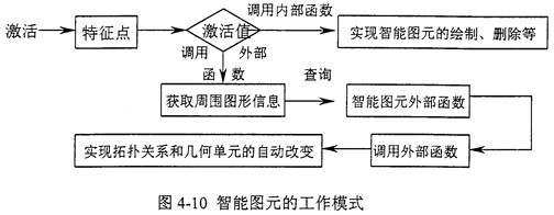 通過對特征點的激活,首先判斷激活值,是調用外部函數還是調用內部函數,如果是調用內部函數,則根據激活值,調用某個內部函數,實現智能圖元自身的操作,如刪除、放大、旋轉等等;如果是調用外部函數,則再獲取周圍圖元信息,并以此查詢外部函數庫,得到某個外部函數,則調用此外部函數,實現智能圖元的拓撲關系和幾何單元信息的改變。(如圖4-11所示)