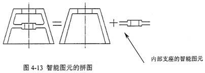 對于每一張工程產品圖紙,盡管圖與圖之間是千差萬別的,但是一個產品圖的某個結構總是可以從其他零產品圖中找到相同或相似的。為了有效地利用這些相同或相似的圖形單元,提出拼圖法繪圖:在裝配圖中,一個機器由若干個零件圖組裝而成;而在零件圖中,一個零件可看作是由若干圖形單元組成,如:一個零件外型圖形單元和若干個零件內腔圖形單元(包括開孔)組成。歸納來說,無論是裝配圖還是零件圖,都是由若干圖形單元拼成,而且不是簡單的把圖形放到一起,還存在圖形單元的變化。例如:由零件圖拼成裝配圖中,需要有部分零件圖的打斷、消隱等工作;由零件外型圖形單元和內腔圖形單元組成零件圖時,更要涉及到圖形圖形之間的打斷、消隱、圓角化等等。這就決定了圖形單元應具有部分智能化,命名為智能圖元,它與普通的圖形單元最大的不同在于:智能圖元可以在不同的周圍圖形環境下自動調整其表現形式。這種以“智能圖元”為設計單元的設計方法稱為智能圖元法。