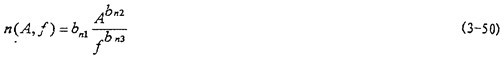 (A,f,x, )是振幅A、激勵頻率f、瞬態位移x和瞬態速度 的函數,或者說恢復力Q是剛度函數K1(A),K3(A),K5(A)和阻尼函數C(A,f)以及阻尼成分函數n(A,f)的函數,其中阻尼成分函數n(A,f)描述阻尼的組成情況,n(A,f)=0時,阻尼為干摩擦阻尼,n(A,f)=1時,為粘性阻尼,0<n(A,f)<1時,阻尼由粘性阻尼和干摩擦阻尼組成,n(A,f)>1時,阻尼成為“高階”阻尼。對于(3-47)式,當振幅與頻率一定時,式中的Kl(A),K3(A),K5(A)和n(A,f)均為定數,當振幅A和頻率變化時,它們均是函數,因此參數辨識實質上是參數函數的辨識。首先我們用非線性參數辨識方法Marquardt法,根據試驗所得的數據,按照(3-47)式對每一遲滯回線進行參數辨識,可以得到對應的K1(A),K3(A),K5(A),C(A,f)和n(A,f)值,對每種工況下的數據隨振幅和頻率變化趨勢進行分析后,可以建立剛度函數、阻尼函數和阻尼成份函數的數學表達式為: