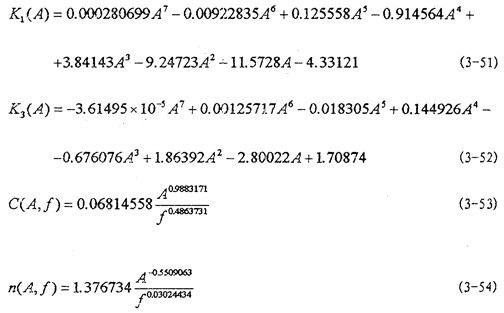 然后用線性參數辨識法和非線性參數辨識法,根據上面已經得到的各個工況下K1(A),K3(A),K5(A),C(A,f)和n(A,f)的數值對(3-48)、(3-49)、(3-50)式中各參數進行辨識,將辨識得到各參數代入(3-48)、(3-49)和(3-50)式得:
