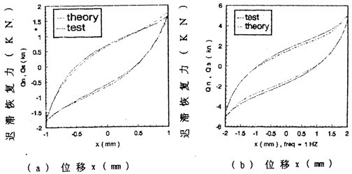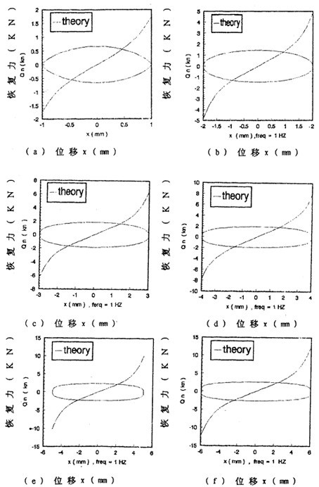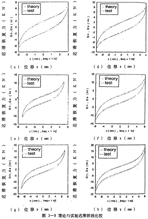 由數學模型(3-47) 計算可以得到不同激勵頻率和振幅下聯軸器恢復力遲滯回線數據,為了證實(3-47)的正砷性,下面畫出頻率為1赫茲、振幅為1~8毫米各工況下數學模型計算的理論數據和試驗數據表示的遲滯回線圖,如圖(3-8)(a)~(h)(見51~52頁)所示,圖中虛線為理論回線,實線為試驗遲滯回線。從圖中可知,理論遲滯回線十分接近試驗遲滯回線,由此可以說明建立的聯軸器數學模型(3-47)式可較好地描述恢復力隨振幅A頻率f、瞬時位移x和速度分變化的規律,較圓滿地解決了聯軸器恢復力建模與參數函數辨識的難題。