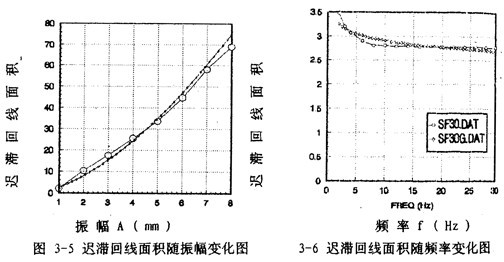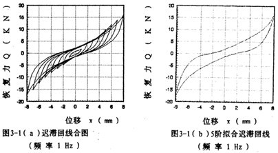 為了說明5階和7階冪函數多項式擬合的精度情況,以振幅A=8毫米,頻率為1赫茲為例,畫出擬合回線分別如圖3-1(b)、3-1(c)所示,將它們與對應試驗回線圖3-1(d)比較,可知7階擬合精度高于5階。圖3-1(e)為圖3-1(b)與圖3-1(d)的合圖。