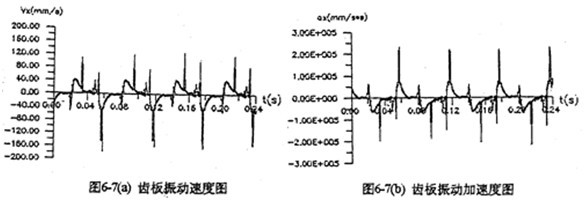 圖6-7是某相雙曲柄機構在輸入端具有0.03mm間隙時,齒板及軸承座的振動速度、振動加速度。圖中表明,速度、加速度都在兩個死點位置出現較大的沖擊值。