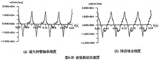 增大行星軸承剛度的目的在于減小雙曲柄機構的變形,降低死點沖擊幅值。并且使各相嚙合力均衡化、減小嚙合沖擊。圖6-20是分別將行星軸承剛度增加一個數量級和內齒圈降低一個數量級時齒板的振動加速度。兩者加速度幅值均降低了1/4 倍左右。