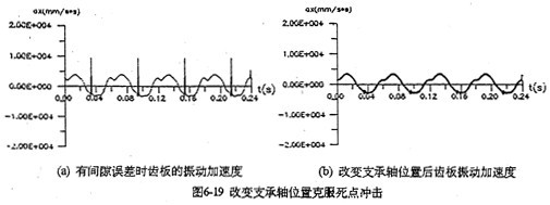 在上一章已經分析過,當三軸水平布置而且高速軸在輸出軸的同側時,載荷幅值最大,各相嚙合力等都很不均衡(見圖5-24)。圖6-19是將支承軸布置在輸入軸與輸出軸間的150°位置時齒板的振動加速度。由圖可知,因誤差引起的沖擊已被完全克服,而且原有的穩態幅值也降低了很多。