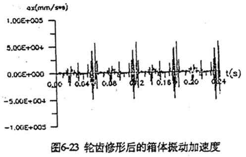 增加高速軸的剛度是降低沖擊載荷的重要途徑。軸的剛度大(值徑大),扭轉、彎曲變形小,雙曲柄機構變形也就小,這樣既減小了沖擊振動、又增加了軸的強度。圖6-22將高速軸的直徑由原來的45mm加到55mm后的,振動加速度圖。