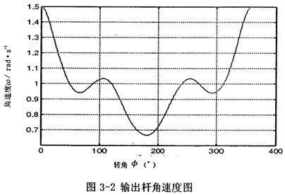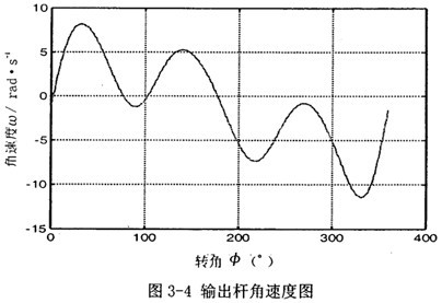 第二種情況 第一輸入速度和第一種情況的速度值相同,現第二輸入經螺旋機構轉化為往復運動后,輸入速度為v=sinθ1(θ1為第一輸入角位移),即為滑塊3的速度,再編程計算,得出結果如圖3-4,圖3-5所示。