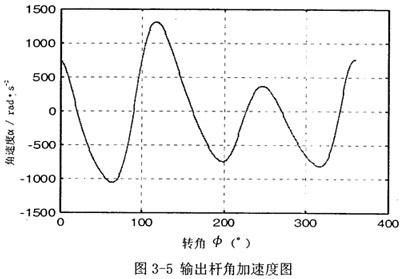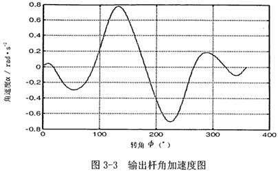 首先由圖3-2可以看到,若機構結構參數設計恰當,并且調整中間滑塊3偏移到合適的位置時,可在一定范圍內,產生一個反向的速度波適度抵消原速度波動。再由圖3-3可知,在未加入第二自由度時,加速度變化值不大,說明阻力矩和電機主動力矩不會受到大的影響,不致導致原機械系統的各項參數發生大的變化。