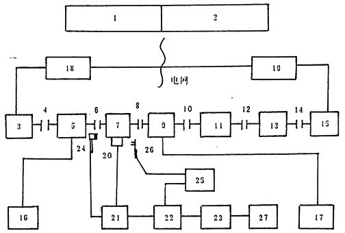 試驗時,通過控制臺1,2調(diào)節(jié)控制系統(tǒng)讓交直流機(jī)組18發(fā)出適當(dāng)?shù)闹绷麟妷菏怪绷鳒y功機(jī)3(工作于恒速電動工況)按恒定轉(zhuǎn)速轉(zhuǎn)動,通過聯(lián)軸器4,6和輸入轉(zhuǎn)速扭矩傳感器5與試件7輸放端(高速端)相聯(lián)接。試件7輸出端通過聯(lián)軸器8,10,12,14及輸出扭矩傳感受器9、升速用11、汽車變速箱13而與直流測功機(jī)15(工作于恒電流工況)聯(lián)接,驅(qū)使其發(fā)出適當(dāng)電壓的直流電,再通過交直流機(jī)組19將其逆變成為工頻北流電返回電網(wǎng),完成整個電功率封閉閉鏈。