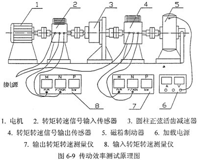 機械傳動件的性能是工程界十分重視的一個問題,它直接影響產品成本及能源消耗,每個設計師都希望自己設計的機器是一臺高效率,噪聲低,振動小,溫升低的機械。但是,由于機器結構等因素的影響,實際機器很難達到理想的計算效率及其它設計參數,實際機器效率受加工精度和裝配精度及使用條件等因素影響將低于計算效率,這就需要進行試驗研究,以測量實際機器的效率值和與其相關的參數,給傳動裝置的選擇及改進設計提供數據。為此,本文對圓柱正弦活齒減速器樣機進行了傳動比及傳動效率試驗研究,試驗裝置的工乍原理如圖6-9所示。試驗臺的實物照片如圖6-10所示。