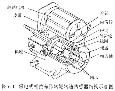 圖6-11為磁電式相位差型轉矩轉速傳感器的結構示意圖,它由機座、端蓋、扭力軸、內齒輪、外齒輪、磁鋼、線圈軸承等組成。內齒輪、磁鋼固定在套筒上,線圈固定在端蓋上,外齒輪固定在扭力軸上,當內外齒輪發生相對轉動時,由于磁通不斷變化,在線圈中便感應出近似正弦波的感應電勢ul、u2,兩感應電勢的初始相位差是恒定的,考慮到正反加載, 設計在大約180°位置上,當加上扭力時,扭力軸發生扭轉變形,在彈性范圍內外加扭矩與機械扭轉角成正比,這時ul、u2訊號的相位差要發生變化,即