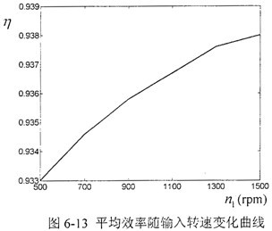 同樣方式測得當輸入轉速分別為700rpm、900 rpm、1100 rpm、1300 rpm、1500 rpm時,減速呂樣機的平均效率隨輸入轉速變化曲線如圖6-13。通過測試結果表明,在低中速情況下,減速器的傳動效率受其轉速的影響不明顯,由于此時潤滑脂溫度較低,隨著轉速的增加,減速器的傳動效率略有提高,其平均值在93%以上,由引說明本文設計的減速器具有較高的傳動效率。