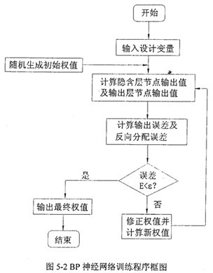 三層前饋型BP網(wǎng)絡(luò)采用BP算法來調(diào)整網(wǎng)絡(luò)連接權(quán)值和節(jié)點(diǎn)閾值。BP算法,即誤差逆?zhèn)鞑W(xué)習(xí)方法,是一種曲型的誤差修正方法。BP算法是一個(gè)種有教師的學(xué)習(xí)算法,整個(gè)網(wǎng)絡(luò)學(xué)習(xí)過程由信息的正向傳動(dòng)播和誤差的反向傳播兩上階段構(gòu)成,在正向傳播的過程中,輸入信息從輸入層經(jīng)隱含層逐層處理,并傳向輸出層,如果不能在輸出層得到期望的輸出,則轉(zhuǎn)入反向傳播,運(yùn)用梯度下降法連接權(quán)關(guān)于誤差函數(shù)的導(dǎo)數(shù)沿原來的連接通路返回,通過修改各層的權(quán)值使得誤差函數(shù)減小,直到達(dá)到收斂為止。神經(jīng)網(wǎng)絡(luò)練過程如圖5-2所示。