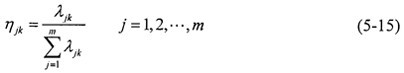 對(duì)象矩陣進(jìn)行聚類,聚類類別選為“1”、“2”、“3”三類,其白化函九分別與式(5-12)~(5-14)和圖5-4對(duì)應(yīng)。現(xiàn)以f1為例,說明求得白化函數(shù)閾值的方法。對(duì)應(yīng)象矩陣中的第一列,d(max)=1;d(mean)=0.917,取0.9,d(min)=0.8621,取0.86。因此,對(duì)于灰類1,有x1=0,x2=1;對(duì)于灰類2,有x1=0,x2=0.9,x3=2×x2=1.8;對(duì)于灰類3,有x1=0.86,x3=2×x1=1.72。同理可求出其余各分目標(biāo)各類白化權(quán)的閾值,代入式(5-12)~(5-14)中求出各類白化權(quán)函數(shù)及其值。按式(5-15)求出標(biāo)定聚類權(quán)矩陣η