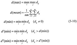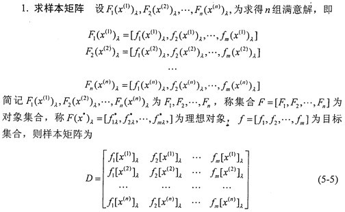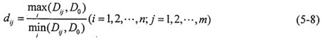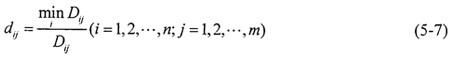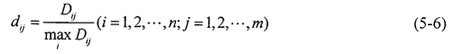 2.求轉(zhuǎn)換樣本矩陣 即象矩陣 由于指標(biāo)不同,要求不同,因此有必要按上限效果測(cè)度、下限效果測(cè)度、中心效果測(cè)度來統(tǒng)一樣本。當(dāng)指標(biāo)要求“越大越好”時(shí),可用上限效果測(cè)度,記統(tǒng)一后的樣本為dij,則有