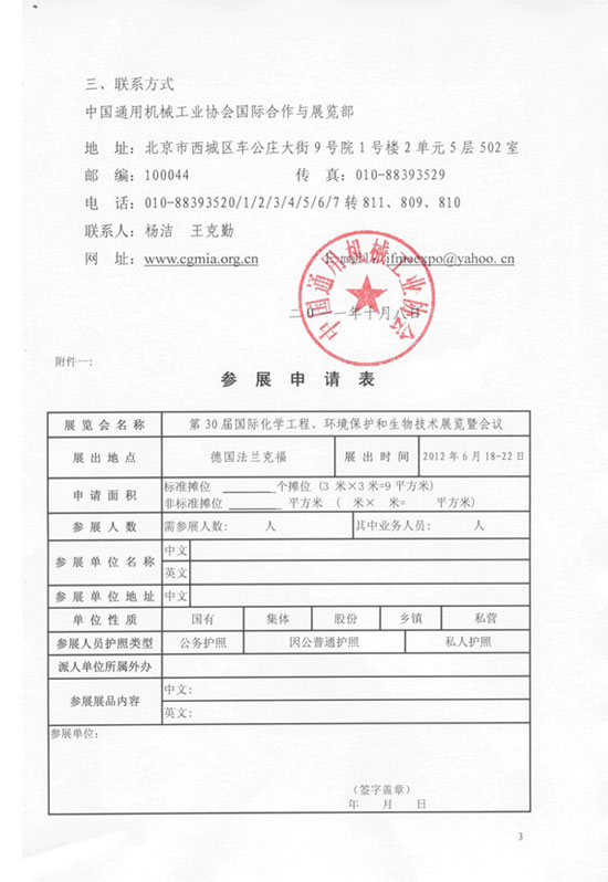 參展方式:預參展會員企業于2011年10月31日前向各專業分會報名并說明參展面積;總會統計參展商人數及參展面積后,向阿赫瑪展會主辦方申請參展總面積,待主辦方確認面積及價格后,向各參展商通報最終展位價格并與之共同協商展位分布。《參展申請表》見附件一。