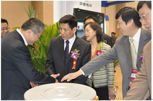 原國務院國資委監事會主席喬龍德、中材國際工程股份有限公司副總裁方芳在展臺前