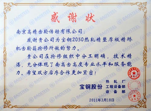 最終,在南高齒生產和技術部門的緊密配合下,經過一個月的緊張搶修,南高齒比寶鋼要求的3月21日,提前一天完成了齒輪箱的修復,受到寶鋼有關領導部門的表彰。