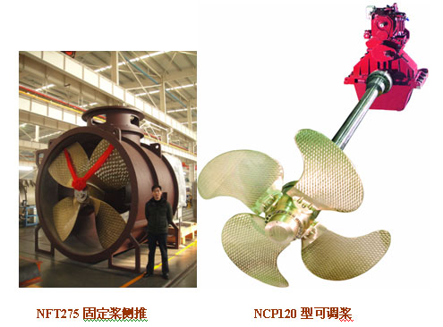 其中NCP120型可調槳最大傳遞能力為55.4kW/rpm,螺旋槳最大推力達110t,是目前國內傳遞能力最大,推力最大的可調槳;NFT275固定槳側推最大傳遞功率為3000HP,槳葉直徑2750mm,是目前國內生產的規格最大的側推;CGS船用齒輪箱具有承載推力大、齒輪承載能力高、穩定性好等特點,在相同工況下相較傳統產品在選型上可以降低一個規格,從而減少了齒輪箱的重量,降低了船廠采購成本;CKV可調槳船用齒輪箱是為可調槳推進系統專配的齒輪箱,可以一個輸入拖帶二到四個輸出,具有結構新穎,體積小、性價比高等特點。