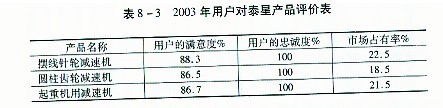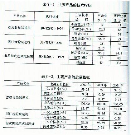 公司董事長張國林提出并率先在泰星減速機股份有限公司全面推行的以“三改、三制、三化”為主線的一系列的管理理念、管理模式、管理方法、運行機制和創(chuàng)新機制,不僅對公司的內(nèi)部管理產(chǎn)生了巨大的成效,取得了很好的企業(yè)效益,且得到了社會的廣泛認可,產(chǎn)生了很好的社會效應和一定的理論效應。 I 推動企業(yè)發(fā)展 創(chuàng)造了超一流的產(chǎn)品 泰星減速機股份有限公司正是認真貫徹了公司董事長張國林的“一保產(chǎn)品質(zhì)量,二保供貨期”的質(zhì)量思想,在企業(yè)員工中形成了一種“用戶在我心中、質(zhì)量在我手中、用戶的需求就是我們的追求、用戶滿意才有我們的滿意”的質(zhì)量共識,為用戶提供了國內(nèi)領先、國際一流的高質(zhì)量的產(chǎn)品。 泰星產(chǎn)品的高質(zhì)量體現(xiàn)在:代表主要產(chǎn)品質(zhì)量水平的主要技術指標遠遠超過了同行業(yè)的最佳水平。見表8—1。 主要產(chǎn)品的質(zhì)量指標遠遠超過了國內(nèi)的最好水平。主要產(chǎn)品的質(zhì)量水平見表8—2。 到2004年泰星減速機股份有限公司的產(chǎn)品合格率連續(xù)11年達到100%,一等品率2004年達到95.3%,優(yōu)等品率達到72.50%。 泰星公司生產(chǎn)的產(chǎn)品噪音低,無污染,環(huán)境指標達到了國內(nèi)的同行業(yè)的領先水平。  增強了研發(fā)能力 公司董事長張國林認識到:“技術創(chuàng)新是企業(yè)發(fā)展的關鍵。沒有先進的技術,先進的設備和工藝,就不可能生產(chǎn)出質(zhì)量過硬的產(chǎn)品,企業(yè)也無法立足于市場,擴大規(guī)模,企業(yè)發(fā)展也就成為一句空話”。因此,董事長張國林非常重視企業(yè)科技開發(fā)工作,一方面,不斷加大公司的科技研發(fā)費用的投人,早在2000年泰星減速機股份有限公司的研究與開發(fā)費用已經(jīng)占到公司當年銷售收入的9.7%,遠遠超過了國內(nèi)同行業(yè)企業(yè)的先進水平,已經(jīng)接近國外大型跨國公司10%的最好水平,泰星股份公司的研究與開發(fā)費用還在以每年20%的速度在增長;另一方面,為了提高企業(yè)的技術研發(fā)能力,泰星股份公司于1998年初就成立了減速機研究所,研究所取得了豐碩的科研成果,他們自主設計、自主研制、自主開發(fā)的9000系列擺線釷輪減速機、9000系列硬齒面減速機、9000系列中硬齒面減速機達到了國際21世紀先進水平。 營造了整潔的工作環(huán)境 泰星股份公司董事長張國林認為:一方面,優(yōu)美的廠區(qū)環(huán)境,是企業(yè)領導層富有戰(zhàn)略眼光的重要反映,也是企業(yè)形象和職工精神面貌的綜合體現(xiàn)。它有利于避免因外部環(huán)境干擾而引起的不良心理和生理現(xiàn)象,激發(fā)職工的勞動熱情,提高勞動生產(chǎn)率;另一方面,公司的員工每天要在公司工作八個小時,公司、工廠、車間的環(huán)境美化了,能為員工營造一個舒適的工作環(huán)境,保證員工心情愉快,使員工處在一種愉悅的工作狀態(tài)中,這樣也有利于產(chǎn)品質(zhì)量的提高。因此,按照定制工藝的要求,本著使人機物處于最佳優(yōu)化組合狀態(tài)的原則,對公司的各個部門,車間內(nèi)部進行了合理的平面布置,并重點抓了“兩通”“三化”工程建設,不僅保證了車間內(nèi)的工作環(huán)境清潔、整齊,且使整個廠區(qū)布局合理、美麗、整潔。難怪國外的 同行來星股份公司考察時,發(fā)出了這樣的贊嘆:“簡直就是一座花園式的工廠”。 形成了愛廠如家的工作熱情 沒有工作制度,沒有任何約束,員工自愿一天為企業(yè)工作14個小時。這種工作熱情在目前的市場經(jīng)濟社會中是罕見的。泰星公司員工的這種工作熱情來源于張國林董事長提出的“能上能下,競爭上崗:實績計酬”,“生活溫暖化”等一系列管理理念、管理方法在太星中的推行張董事長的這些管理理念與管理方法的實施,在企業(yè)內(nèi)部為員工們創(chuàng)造了一種發(fā)揮自己的才能,發(fā)揮自已的水平:一切憑實績講話,~切憑數(shù)據(jù)講話的氛圍。讓員工們也感受到了為企業(yè)工作的甜頭,感受到了他們的切身利益是與企業(yè)的榮辱:興衰密不可分的。因此,員工們愿意也樂意為企業(yè)工作。 創(chuàng)造了領先同行業(yè)十年的輝煌業(yè)績 由于董事長張國林治企有方,使泰星公司得到了快速的發(fā)展。在1993年,衡量公司經(jīng)濟效益的主要指標:資金利潤率、銷售利潤率、成本費用利潤率、總資產(chǎn)貢獻率、流動資金周轉率、全員勞動生產(chǎn)率:產(chǎn)品銷售率、質(zhì)量損失率、新產(chǎn)品產(chǎn)值率以及萬元總產(chǎn)值綜合能耗均保持在全國同行業(yè)的領先水平。 在2003年泰星股份公司的主要經(jīng)濟效益指標分別為:總資產(chǎn)零獻率為29.25%,資本保值增值率127.83%,資金周轉率2.64次,成本費用利潤17.33%,全員勞動產(chǎn)生產(chǎn)率22.36萬元/人,產(chǎn)銷率100.30,產(chǎn)品質(zhì)量等級品率120.72%,質(zhì)量損失率為0.38,新產(chǎn)品產(chǎn)值率25.08,萬元總產(chǎn)值綜合能耗為0.158噸/萬元。 贏得了客戶的信賴 目前,泰星減速機股份有限公司的用戶已經(jīng)遍布全國各地,正在擴展到世界各地。國內(nèi)許多大的工程如:長江三峽水利工程,江陰長江大橋建設工程,黃河小浪底工程,葛洲壩工程,西氣東輸工程,南水