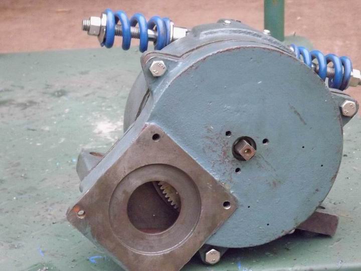 行星減速器中內齒輪靠摩擦聯結器的摩擦作用“固定”在減速器殼內,內齒輪里裝有外齒輪。外齒輪通過滾動的軸承裝載偏心的軸套上。偏心軸套用鍵又固定在輸入軸上。外齒輪上有八個圓孔,每孔插入一跟套有滾套的滾棒。八根滾棒固定在輸出軸的輸出圓盤上。當外齒輪作擺式旋轉時,輸出軸就隨著旋轉。當輸入軸隨第一級減速齒輪順時針旋轉時,偏心軸套也順時針旋轉,使外齒輪在內齒輪里沿內齒圈作逐齒咬合的偏心運動。外齒輪41齒,內齒輪42齒,兩者相差1齒。因此,外齒輪作一周偏心運動時,外齒輪的齒在內齒輪里錯位一齒。正常情況下,內齒輪靜止不動,迫使外齒輪在一周的偏心運動中反方向旋轉一齒的角度。(即輸入軸順時針方向旋轉41周,外齒輪逆時針方向旋轉一周)帶動輸出軸逆時針方向旋轉一周,這樣達到減速目的。外齒輪既在輸入軸的作用下作偏心運動,又與內齒輪作用作旋轉運動,類似于行星運動,既有公轉,又有自轉。