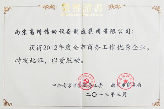 南高齒獲2012年度南京市商貿(mào)工作優(yōu)秀企業(yè)稱號