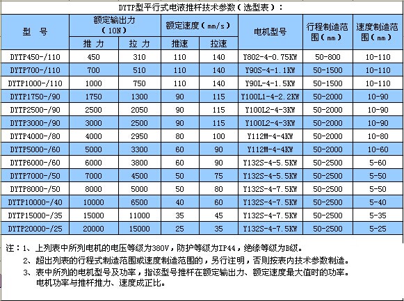 電液推桿主要是由推桿的型式、電機(jī)的防護(hù)等級(jí)、額定輸出力、行程、額定速度和使用角度等六大基本要素組成,還可根據(jù)擁護(hù)特殊要求,配套三種調(diào)節(jié)功能,即:速度調(diào)節(jié)推、拉力調(diào)節(jié),行程調(diào)節(jié)(行程開關(guān)定位)。除上述三種調(diào)節(jié)功能定貨時(shí)必須文字注明外,其他請(qǐng)參照型號(hào)編制方式,認(rèn)真填寫六大要素。 DYTP型平行式電液推桿技術(shù)參數(shù)(選型表)