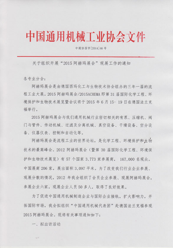 2015年減變速機分會與中國通用機械工業(yè)協(xié)會共同組織減變速機行業(yè)企業(yè)觀展2015阿赫瑪展會。根據(jù)中國通用機械工業(yè)協(xié)會要求9月25日前上報觀展人員名單,具體事宜請參考中通協(xié)國字【2014 】46 號,有意向觀展的企業(yè)請抓緊時間上報名單。