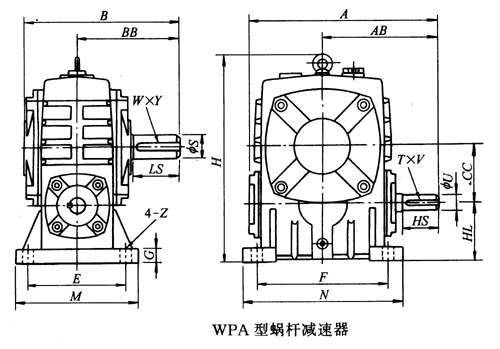 WPA40、WPA50、WPA60、WPA70、WPA80、WPA100、WPA120、WPA135、WPA155、WPA175、WPA200、WPA250、型蝸輪蝸桿減速器主要尺寸