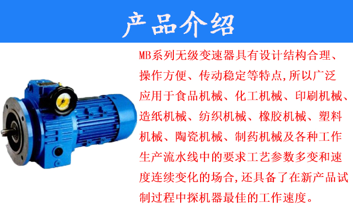 MB系列無級變速器具有設計結構合理、操作方便、傳動穩定等特點,所以廣泛應用于食品機械、化工機械、印刷機械、造紙機械、紡織機械、橡膠機械、塑料機械、陶瓷機械、制藥機械及各種工作生產流水線中的要求工藝參數多變和速度連續變化的場合,還具備了在新產品試制過程中探求機器最佳的工作速度。