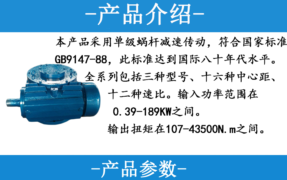 本產(chǎn)品采用單級(jí)蝸桿減速傳動(dòng),符合國家標(biāo)準(zhǔn)GB9147-88,此標(biāo)準(zhǔn)達(dá)到國際八十年代水平。全系列包括三種型號(hào)十六種中心距、十二種速比。輸入功率范圍在039-18K之間,輸出扭矩在107-43500Nm之間。