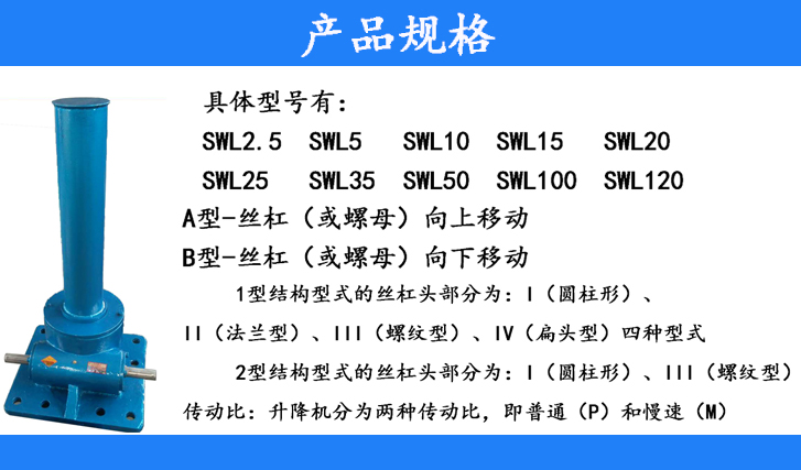 承載能力2.5—120T。具有結構緊湊、積小、重量輕、動力源廣泛、無噪音、安裝方便、使用靈活、功能多、配套形式多、可靠性高、使用壽命長許多優點。具有提升、降落、推進、翻轉等多種功能,可以單臺或組合使用,能按一定程序準確地控制調整升或推進的高度,可以用電動機或其它動力直接帶動,也可以手動。最高輸入轉速1500r/min,最大提升速2.7m/min。有不同的結構型式和裝配方式,提升高度按用戶的要求制造。該裝置可以自鎖。