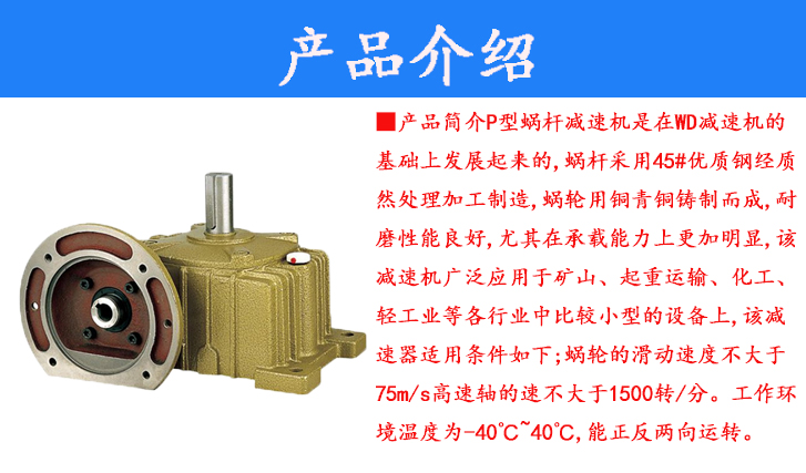P型蝸桿減速機是在WD減速機的基礎上發(fā)展起來的,蝸桿采用45#優(yōu)質(zhì)鋼經(jīng)質(zhì)然處理加工制造,蝸輪用銅青銅鑄制而成,耐磨性能良好,尤其在承載能力上更加明顯,該減速機廣泛應用于礦山、起重運輸、化工、輕工業(yè)等各行業(yè)中比較小型的設備上,該減速器適用條件如下;蝸輪的滑動速度不大于75m/s高速軸的速不大于1500轉(zhuǎn)/分。工作環(huán)境溫度為-40℃~40℃,能正反兩向運轉(zhuǎn)。