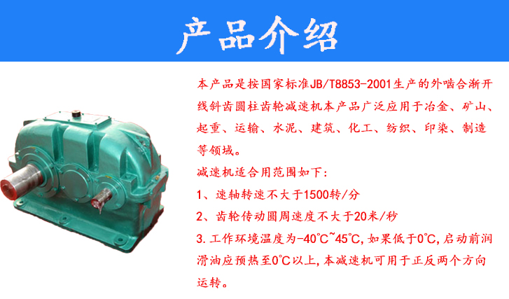 本產(chǎn)品是按國家標(biāo)準(zhǔn)JB/T8853-2001生產(chǎn)的外嚙合漸開線斜齒圓柱齒輪減速機(jī)本產(chǎn)品廣泛應(yīng)用于冶金、礦山、起重、運(yùn)輸、水泥、建筑、化工、紡織、印染、制造等領(lǐng)域。減速機(jī)適合用范圍如下:1,速軸轉(zhuǎn)速不大于1500轉(zhuǎn)/分2齒輪傳動圓周速度不大于20米/秒。3.工作環(huán)境溫度為-40℃~45℃,如果低于0℃,啟動前潤滑油應(yīng)預(yù)熱至0℃以上,本減速機(jī)可用于正反兩個方向運(yùn)轉(zhuǎn)