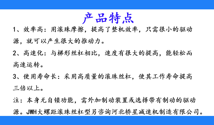 3、使用壽命長:采用高質量的滾珠絲杠,使其工作壽命提高3倍以上