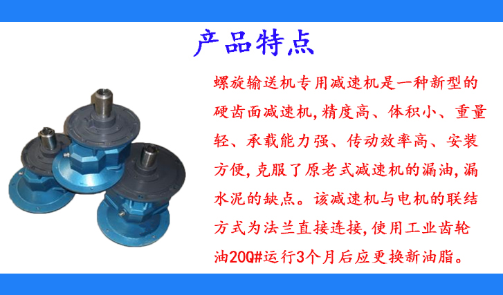 螺旋輸送機專用減速機是一種新型的硬齒面減速機,精度高、體積小、重量輕、承載能力強、傳動效率高、安裝方便,克服了原老式減速機的漏油,漏水泥的缺點。該減速機與電機的聯結方式為法蘭直接連接,使用工業齒輪油20Q#運行3個月后應更換新油脂。